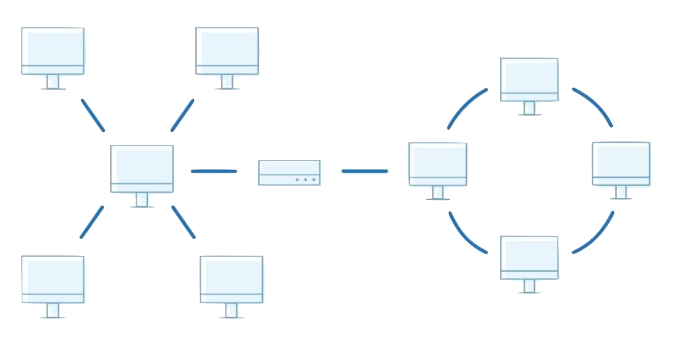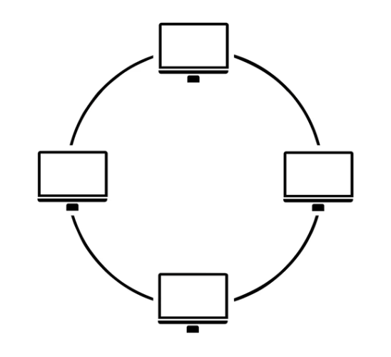 - Structure: Devices are connected in a circular loop, with each device connected to two neighbours.